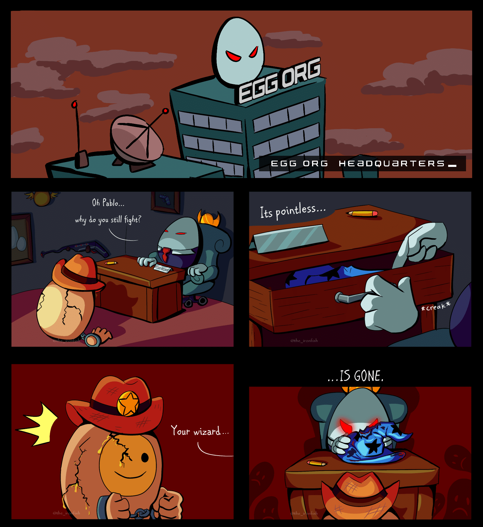 Scattering to the far corners of Eggtopia, the EGG ORG leadership had been wandering and scheming, looking for any scrap of power they could find to turn the tides and claim victory, and in a forgotten mountain cave on the edges of the Eggtopian border, they found it…